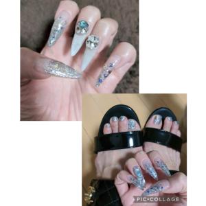 先月ハンドフットネイルと今月ハンドネイル 白マグネットにスワロスキーいっぱいにラメにキラキラホロネイル